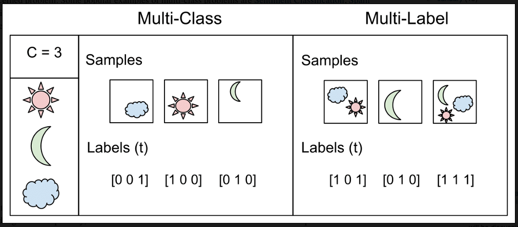 طبقه بندی چند برچسبی، وظایفی هستند که در آن برای هر نمونه دو یا چند برچسب کلاس قابل پیش بینی است. در مثال طبقه بندی عکس، زمانی که یک عکس می تواند شامل چند جزء در تصویر باشد، یک مدل می تواند به پیش بینی چندین برچسب در عکس بپردازد مانند افراد، دوچرخه، سیب و غیره. در شکل زیر تفاوت بین طبقه بندی چندکلاسه و چند برچسبی را مشاهده می کنید.