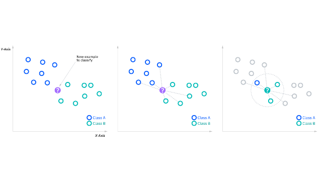 • نزدیک‌ترین همسایه (K-Nearest Neighbors): الگوریتم نزدیک‌ترین همسایه (KNN) نیز برای طبقه‌بندی دودویی مناسب است. در این الگوریتم، بر اساس فاصله نمونه‌ها در فضای ویژگی، همسایگی آن‌ها تعیین می‌شود. با تعیین تعداد همسایه‌ها (K) و با محاسبه اکثریت برچسب‌های همسایه‌ها، می‌توان نمونه‌ها را در دسته مثبت یا منفی طبقه‌بندی کرد.